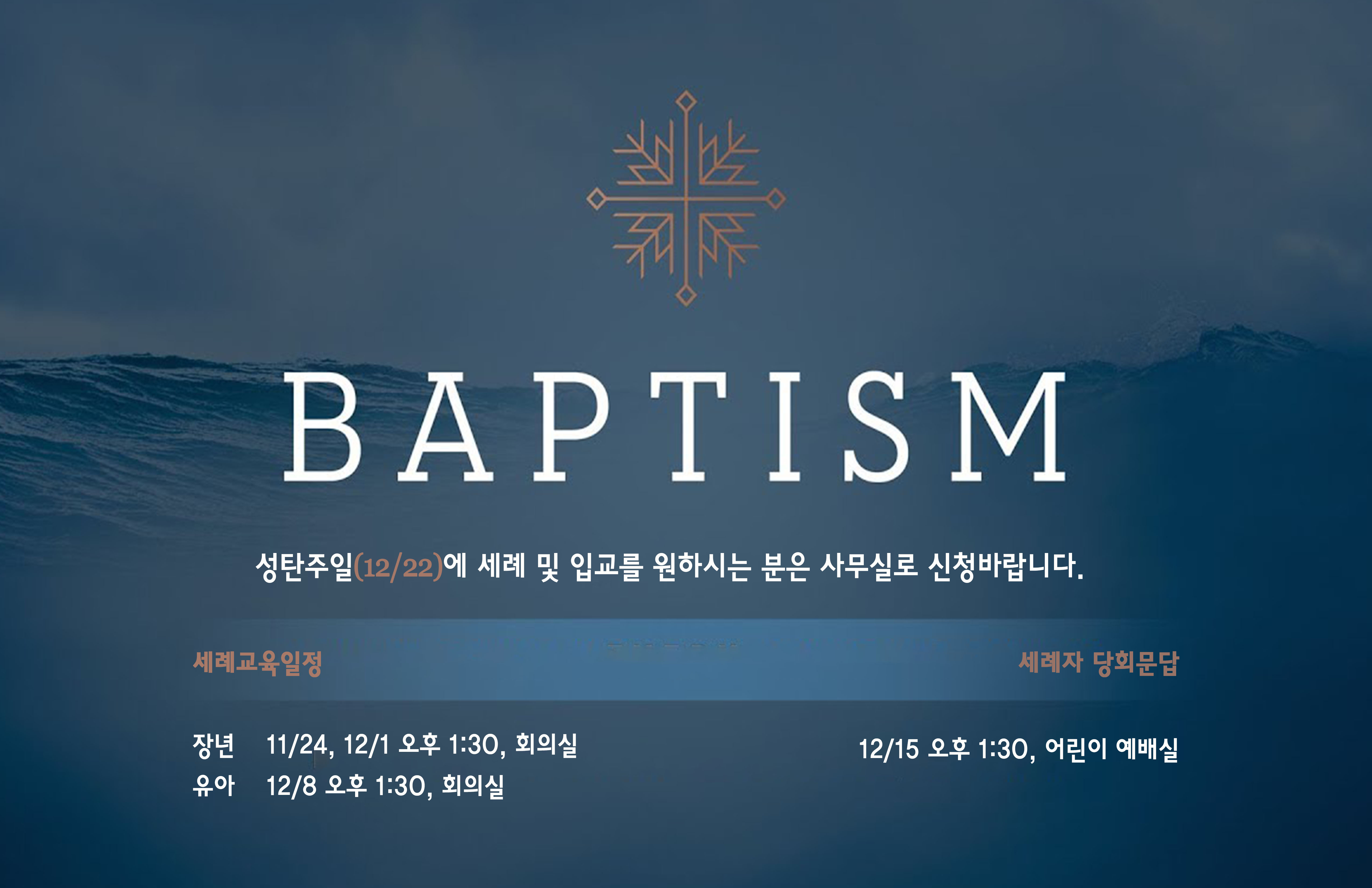 세례신청: 성탄주일(12/22)에 세례 및 입교를 원하시는 분은 사무실로 신청바랍니다. 교육일정: (장년) 11/24, 12/1, (유아) 12/8, 오후 1:30, 회의실 당회문답: 12/15(주일) 오후 1:30, 어린이 예배실
