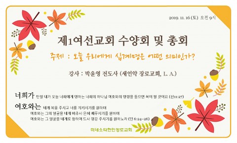 수양회 일정, 11/16/2019 (토) 9:00am ~ 3:30pm “오늘 우리에게 십계명은 어떤 의미인가?” 9:00 ~ 등록 | 장헬렌 집사, 차희경 집사 9:00 ~ 9:30 준비 찬양 | 찬양팀* 개회기도 | 박윤주 장로 9:30 ~ 11:30 강의 I : 오늘 우리에게 십계명은 어떤 의미인가? | 박윤영 전도사 11:30 ~12:00 총회 | 사회 및 기도: 최의숙 집사 (회장) […]