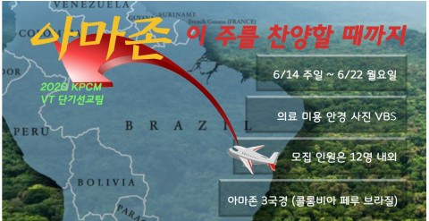주제 – 아마존이 주를 찬양할 때까지 기간 – 6/14 주일저녁 – 6/22 월요일 오전 장소 – 아마존 3국경 (콜롬비아 페루 브라질) 사역내용 – 의료 미용 안경 사진 VBS 모집 인원 – 12명 내외 신청마감 – 3/22 문의 – 마영찬 장로