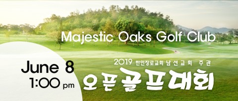 전교인 Golf 대회 주관: 남선교회 일시: 6/8(토) 오후 1시 장소: Majestic Oaks Golf Club-Signature Course 신청/문의: Steve Oh 집사, 박종문 집사, 3부 예배 전후, Lobby