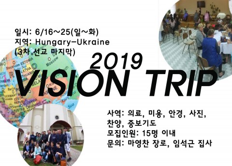 2019 Vision Trip 선교지역: Hungary-Ukraine 지역 일정: 6/16(주일) 오후 출발~6/25(화) 도착 팀원: 김경아, 남도현, 마영찬, 서동화, 안민수, 이진아, 정영환, 정혜림, 현혜인, 홍경숙, 황청수, 황효숙, Steve Chung(총 13명). 기도로 후원해 주시기 부탁드립니다