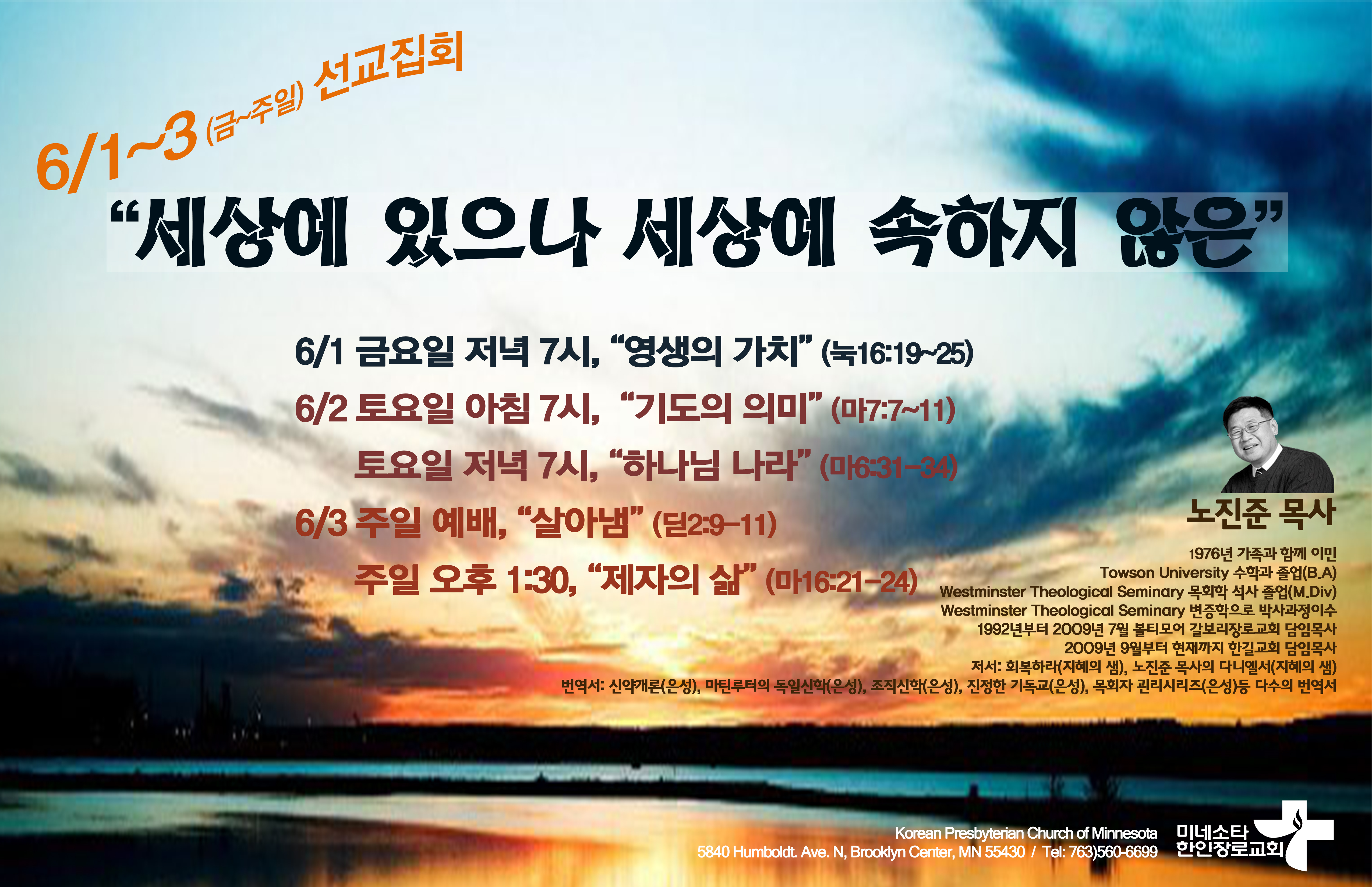 주제: 세상에 있으나 세상에 속하지 않은 6/1 금요일 저녁 7시: 영생의 가치(눅16:19-25) 6/2 토요일 아침 7시: 기도의 의미(마7:7-11) 6/2 토요일 저녁 7시: 하나님 나라(마6:31-34) 6/3 주일 예배: 살아냄(딛2:9-11) 6/3 주일 오후 1:30: 제자의 삶(마16:21-24) 노진준 목사 1976년 가족과 함께 이민 Towson University 수학과 졸업(B.A) Westminster Theological Seminary 목회학 석사 졸업(M.Div) Westminster Theological Seminary […]