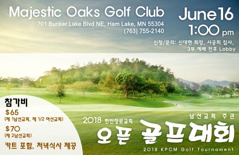전교인 Golf 대회: 남선교회 주관, 6/16 (토) 오후 1시, Majestic Oaks Golf Club – Signature course (신청/문의: 신대현 회장, 사공희 집사, 3부 예배 전후 Lobby, 게시판 참조) 참가비 $65 (제 1남선교회, 제 1/2 여선교회) / $70 (제 2남선교회) 카트 포함, 저녁식사 제공 Majestic Oaks Golf Club 701 Bunker Lake Blvd NE, Ham Lake, MN 55304 (763) 755-2140 https://goo.gl/forms/HoMMhfMpG3FIYWKa2