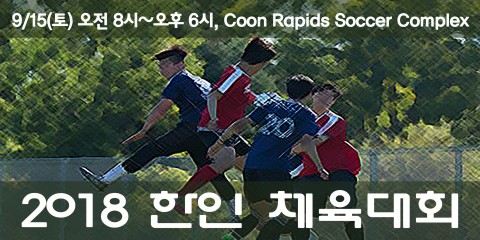 일시: 9월 15일 오전 8시~오후 6시 장소: Coon Rapids Soccer Complex, Coon Rapids, MN 55443 교회대항 경기, 번외 경기, 어린이 Game, 다양한 상품, 전교인 야유회 식사 제공 개인의자나 돗자리를 지참하시기 바랍니다.