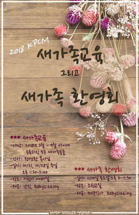 주님의 이름으로 문안드립니다. 하나님의 은혜와 인도하심가운데 본교회에 등록하시고 한 신앙의 공동체안에서 믿음생활을 함께 하시게 된 것을 환영하며 진심으로 감사드립니다. 다름이 아니오라 이미 교회의 주보소식을 통해 알고 계신 것처럼 올해 하반기 새가족교육과 새가족환영회를 곧 개최할 예정입니다. 새가족 교육과 새가족 환영회 일정을 알려드립니다. *새가족교육: -대상: 2018년 3월 – 9월 사이에 등록하신 모든 새가족분들 -강사: 정영환 목사님 […]