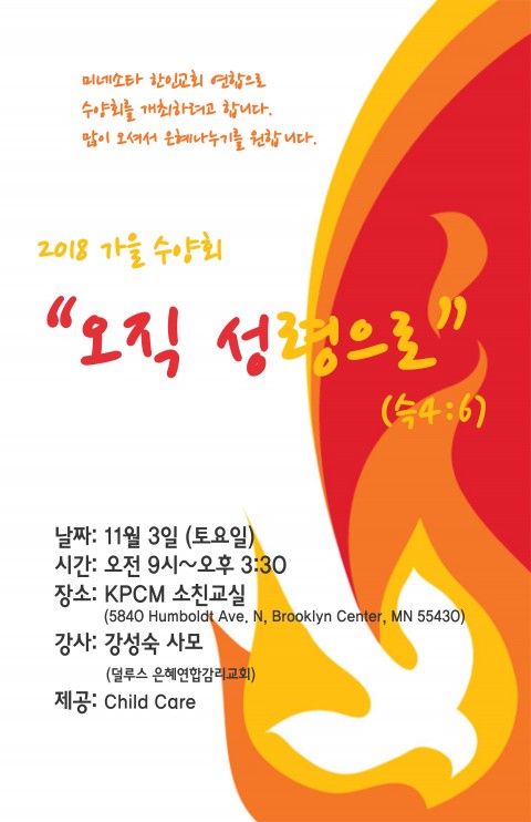 다음과 같이 여선교회 수양회가 있습니다. 올해는 특별히 미네소타에 계신 다른 교회 성도님들도 함께 초대하기로 하였사오니 주변에 아시는 분들 계시면 초대하여 주시면 감사하겠습니다. 수양회 주제 말씀에 힙입어 성령으로 다시 태어나는 우리 모두가 되기를 기도합니다. 일시: 11월 3일 (토) 9:00-3:30 장소: 소친교실 강사: 강성숙 사모님 주제: 오직 성령으로 (스가랴 4:6) 대상: 여성 누구나 (1,2여선교회 및 바울, 타교회도 […]