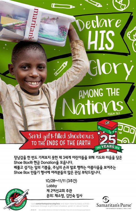 장남감을 한 번도 가져보지 못한 제 3세계 어린이들을 위해 기도와 마음을 담은 Shoe Box와 현금 Donation을 모읍니다. 베풀고 섬기는 일의 기쁨을, 주님의 손과 발로 행하는 아름다움을 보여주는 Shoe Box 만들기 행사에 여러분들의 많은 관심 부탁드립니다. 10/28~11/11 (3주간) Lobby 제 2여선교회 주관 문의: 채소영, 김인숙 집사