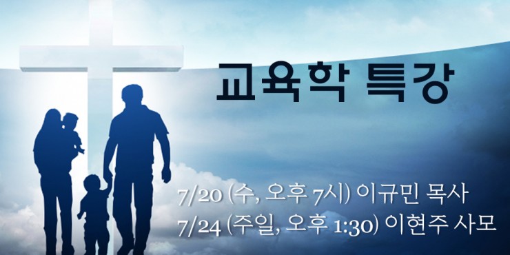 교육학 특강, 7/20 & 7/24 웹에디터 KPCM 최신포커스 이규민 목사 부부 초청 교육학 특강 7/20 (수, 오후 7시), 이규민 교수–“크리스천 가정을 위한 부모교육 세미나” 7/24 (주일, 오후 1시 30분), 이현주 사모–“인터넷 세대를 위한 크리스천 독서 육아”