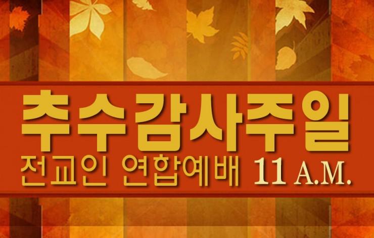 추수감사주일 연합예배 일시: 11/20 (주일), 오전 11시 장소: 대예배당 대상: KM, EM, 중고등부, 어린이부 연합 (당일 예배 1번)