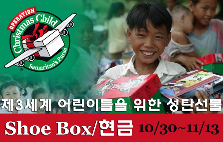 제3세계 어린이들에게 보내는 성탄 Shoe Box 건물과 현금 도네이션을 모으고 있습니다. 기간: 10/30~11/13 장소: 교회 로비 주관: 제2여선교회 문의: 조소정 집사, 남경아 집사 자세한 정보는 게시판을 참고해 주시기 바랍니다.