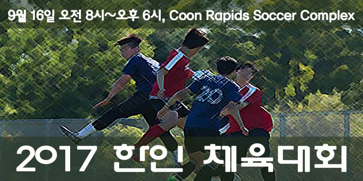 일시: 9월 16일 오전 8시~오후 6시 장소: Coon Rapids Soccer Complex, Coon Rapids, MN 55443 교회대항 경기, 번외 경기, 어린이 Game, 다양한 상품, 전교인 야유회 식사 제공 개인의자나 돗자리를 지참하시기 바랍니다.