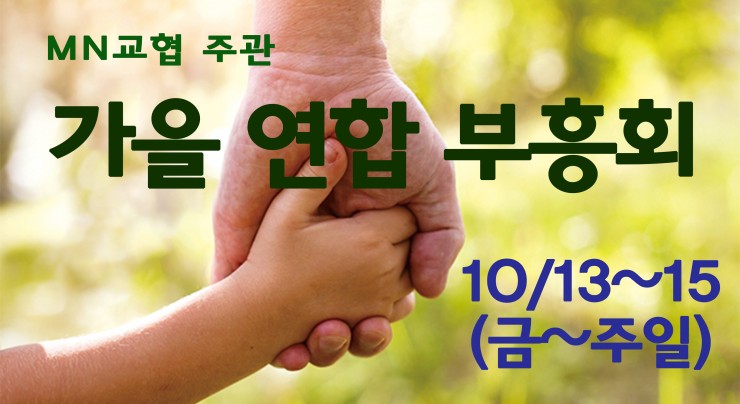 Download 10/13-15 (금-주일) 미네소타 교협 가을연합부흥회 MN Korean Church Revival 강사: 이종안 목사(Rev. CHONG-AN LEE: 뉴저지연합장로교회 원로목사) 장소: 미네소타 복음연합감리교회 주제: 하나님과 동행하는 삶 금요일 저녁- 내일을 계획하는 사람 약 : 4장 13-17절 토요일 새벽- 운명을 바꾼 기도 역대상 : 4장 9-10절 토요일 저녁- 인간의 세가지 본질 살전 : 5장 23-24절 주일 오후 – […]