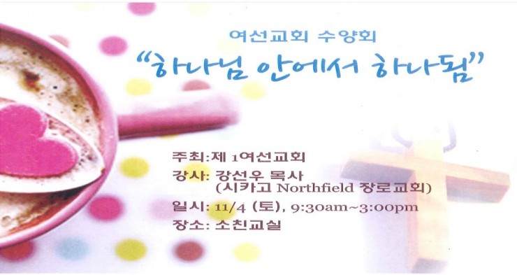 여선교회 수양회 웹에디터 KPCM 최신포커스 수양회: 11월 4일 토요일 9시30분- 3시, 강사: 강선우 목사님. 교육부에서 참여하시는 분들의 사인업을 부탁하십니다. 혹시 사인업 잊고 못하신 경우에는 교육부팀 (김경애, 박은영, 권진희집사님) 아니면 저에게 연락주십시요. 혹시 잊고 사인업 못하셨어도 그날 오시면 됩니다. 수양회때 총회도 있사오니 기도부탁드립니다.