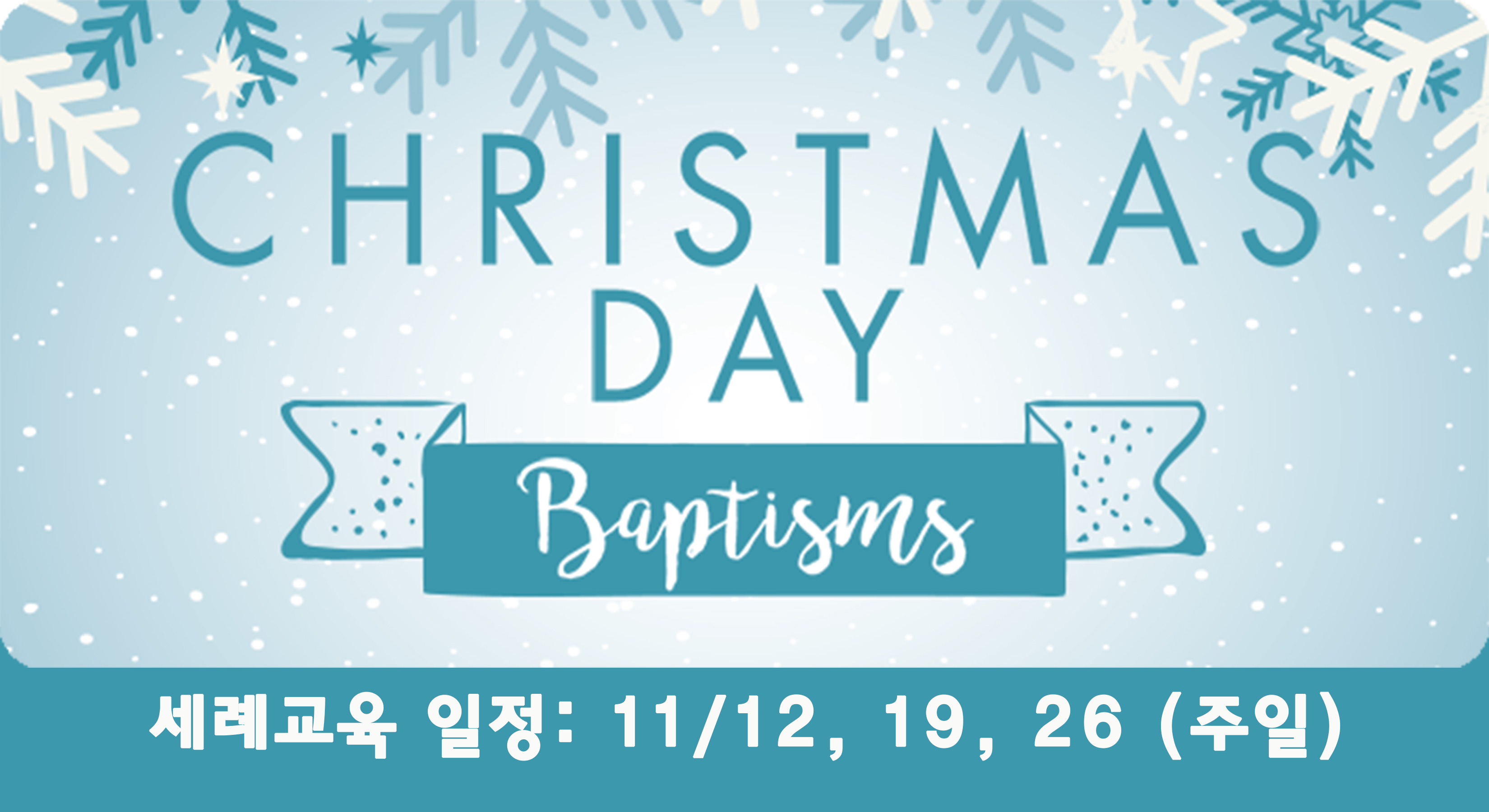 세례식 웹에디터 KPCM 최신포커스 성탄주일(12/24)에 세례 및 입교를 원하시는 분은 사무실로 신청하기 바랍니다 (신청마감: 11/11 토, 세례교육: 11/12, 19, 26 오후 1:30, 회의실).