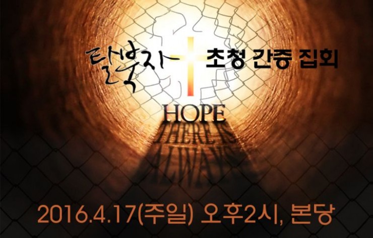 일시: 4/17(주일) 오후 2시 장소: 본당 최근 북한을 탈출하여 한국에서 북한 사역자로 사역 중인 여러분을 모시고 간증 집회를 합니다. 사선을 넘어 새 삶을 찾는 과정에 함께 하신 하나님의 은혜를 나누는 귀한 자리에 여러분 모두를 초청합니다. 박원철 목사 GAP(세계협력선교회) 공동대표 주경배/이소명 부부 극동방송 공동 진행 국방정보본부 자문위원 이기쁨 전 북한군 특수부대 출신 수감 생활 7년 지은혜 […]