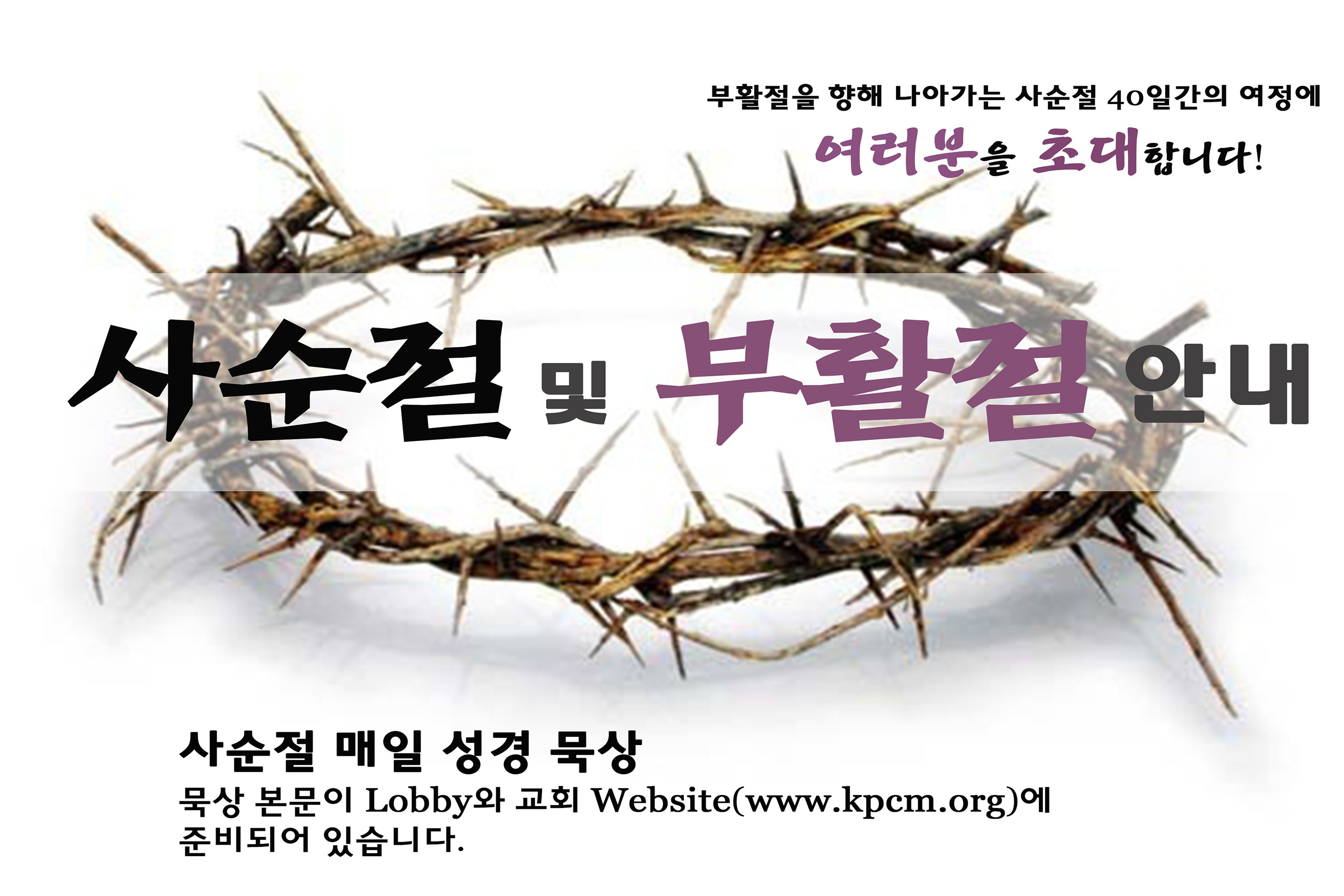 2018 사순절 수요예배. 고난주간 새벽예배. 부활절 예배안내 웹에디터 KPCM 최신포커스 사순절 수요 예배 및 수난 주간 새벽 예배 안내 사순절 수요저녁 예배 주제: 친히 그 몸으로 … 이처럼 사랑하사 (벧전2:24, 요3:16) 주께서 그 몸으로 우리를 얼마나 사랑하셨는가를 살피며 감사함으로 우리도 몸으로 주님을 더욱 사랑하고 섬기기를 기대한다. 2월 14일 눈: 마9:35-38 무리를 보시고 2월 21일 귀: 요한11:1-4 들으시고 2월 28일 […]