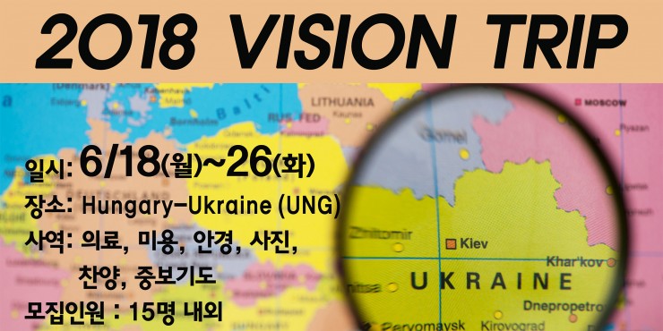 2018 Vision Trip 일시: 6/18(월)~26(화) 장소: Hungary-Ukraine (UNG) 사역: 의료, 미용, 안경, 사진, 찬양, 중보기도