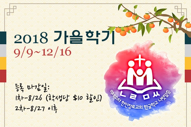 미네소타 한글학교 나랏말씀 입학원서입니다. 2018년 가을학기는 9월 9일부터 12월 16일까지 총 15주간 진행되며 (10/21, 11/18 휴강 포함) 1시 30분부터 3시 30분까지 한글교육 (필수) 1,2교시가 있고 3시 30분부터 4시 30분까지 예술 (음악)반과 태권도반 중 선택할 수 있는 수업이 제공됩니다. 총 9개의 반이 현재 편성되어 있으며 유치부에서 고등반까지 고루 분포되어 있습니다. 등록관련 질문있으시면 klskpcm@gmail.com 으로 보내주시기 바랍니다. 2018 Fall […]