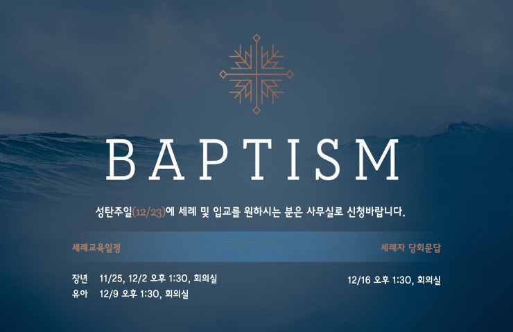 주님의 이름으로 문안드립니다. 하나님의 은혜와 인도하심가운데 본교회에 등록하시고 한 신앙의 공동체안에서 믿음생활을 함께 하시게 된 것을 환영하며 진심으로 감사드립니다. 다름이 아니오라 이미 교회의 주보소식을 통해 알고 계신 것처럼 올해 하반기 새가족교육과 새가족환영회를 곧 개최할 예정입니다. 새가족 교육과 새가족 환영회 일정을 알려드립니다. *새가족교육: -대상: 2018년 3월 – 9월 사이에 등록하신 모든 새가족분들 -강사: 정영환 목사님 […]