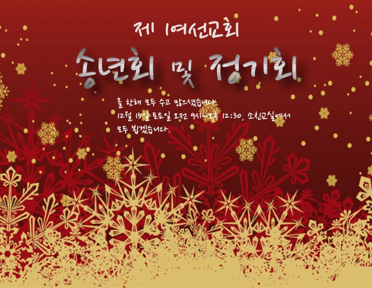 제 1여선교회 송년회/정기회 웹에디터 KPCM 미분류, 최신포커스 제 1여선교회 송년회 및 정기회가 12/15(토) 오전 9시~오후 12:30까지 소친교실에서 있습니다. 2018년 한 해 동안 수고 많으셨습니다.