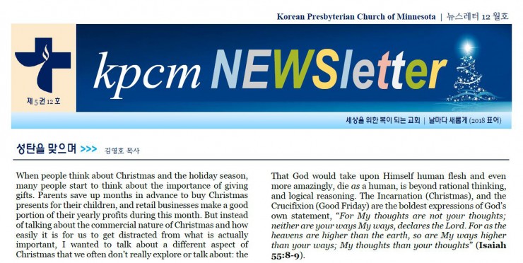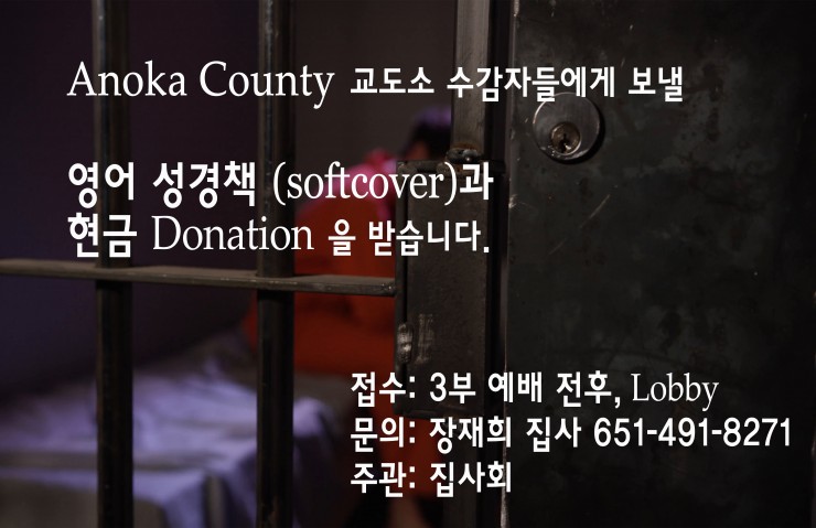 영어성경 웹에디터 KPCM 최신포커스 영어성경: Anoka County 교도소 수감자들에게 보낼 영어 성경책(softcover)과 현금 Donation 을 받습니다. 주관: 집사회 3부 예배 전후 접수: Lobby 문의: 장재희 집사
