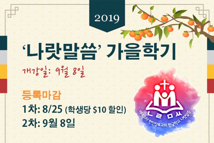 미네소타 한글학교 나랏말씀 입학원서입니다. 2018년 가을학기는 9월 8일부터 12월 15일까지 총 15주간 진행되며 (10/20, 12/1 휴강 포함) 1시 30분부터 3시 30분까지 한글교육 (필수) 1,2교시가 있고 3시 30분부터 4시 30분까지 예술 (음악)반과 태권도반 중 선택할 수 있는 수업이 제공됩니다. 총 10개의 반이 현재 편성되어 있으며 유아부(4세)에서 고등반(12학년)까지 고루 분포되어 있습니다. 등록관련 질문있으시면 언제든지 klskpcm@gmail.com 으로 연락주시기 바랍니다. 감사합니다. 가을학기 […]