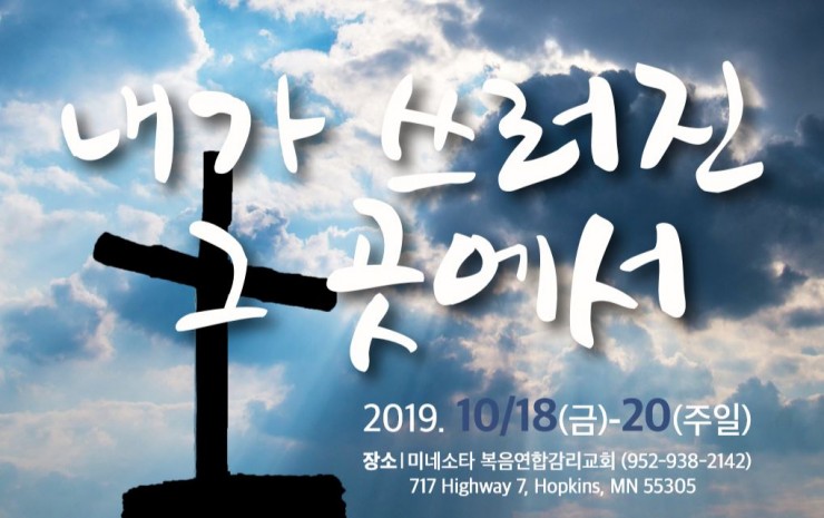 가을 연합 부흥회: MN 한인교회 협의회 주관 주제: “ 내가 쓰러진 그 곳에서” 강사: 송병주 목사 (LA 선한청지기교회 담임목사) 기간: 10/18~20(금~주일) 장소: 복음연합감리교회, 게시판 참조