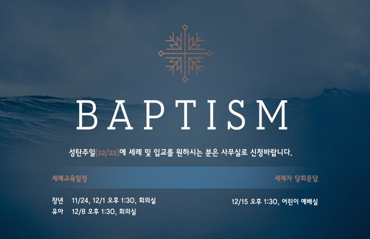 세례신청 웹에디터 KPCM 최신포커스 세례신청: 성탄주일(12/22)에 세례 및 입교를 원하시는 분은 사무실로 신청바랍니다. 교육일정: (장년) 11/24, 12/1, (유아) 12/8, 오후 1:30, 회의실 당회문답: 12/15(주일) 오후 1:30, 어린이 예배실
