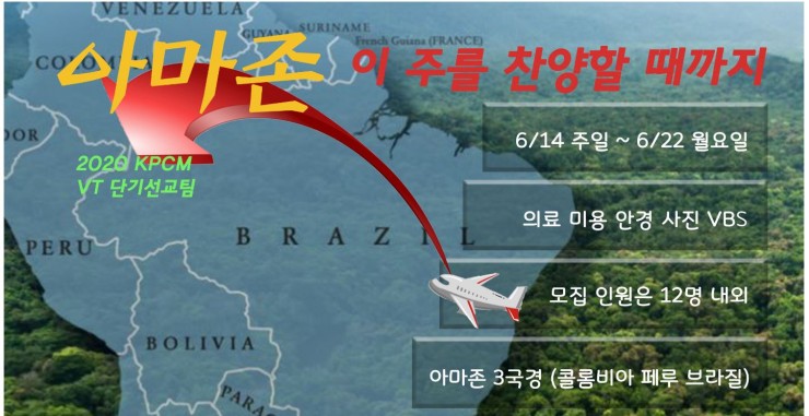 2020 VT 단기선교 웹에디터 KPCM 최신포커스 주제 – 아마존이 주를 찬양할 때까지 기간 – 6/14 주일저녁 – 6/22 월요일 오전 장소 – 아마존 3국경 (콜롬비아 페루 브라질) 사역내용 – 의료 미용 안경 사진 VBS 모집 인원 – 12명 내외 신청마감 – 3/22 문의 – 마영찬 장로