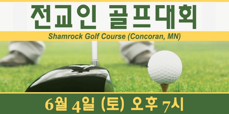전교인 골프대회, 6/4(토) 웹에디터 KPCM 최신포커스 일시: 6/4(토) 오후 12시 장소: Shamrock Golf Course 주최: 제1 & 2 남선교회 신청: 강명섭 장로, 손창수 집사 (3부 예배 전후 Lobby)